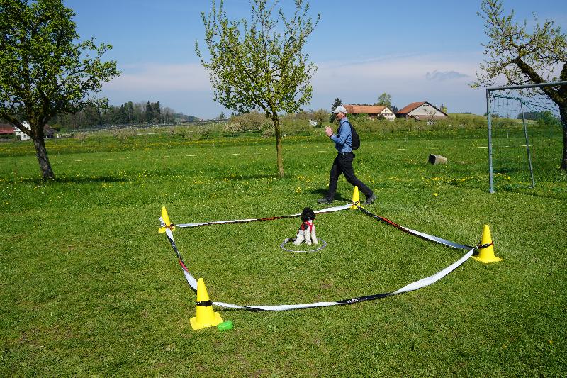 Aufgabe: Der Hund liegt und wartet zwischen einem Robi-Dog-Abfalleimer und Frauchen/Herrchen. Nun müssen Frauchen/Herrchen drei Robi-Dog-Säckli (gefüllte mit Tennisbällen) in den Eimer werfen.